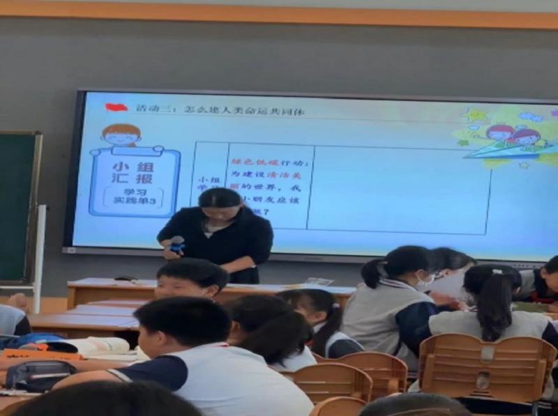 绸都小学的张卫娟老师执教五年级《习近平新时代中国特色社会主义思想学生读本》中的《人类是一个休戚与共的命运共同体》,从疫情时期世界各国对中国的帮助以及中国对其他各国的援助导入,让学生了解到世界是一个同甘共苦的共同体。课堂围绕“什么是人类命运共同体”、“为什么建人类命运共同体”、“怎样建人类命运共同体”三个话题展开,通过学习实践单的方式,让学生在课堂上分小组讨论、交流中明白人类共同体的意义。