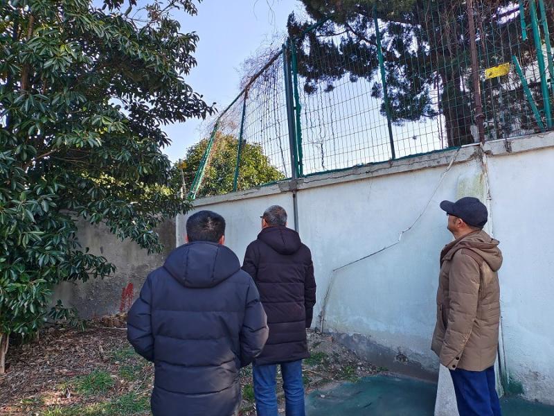新学期即将开始,桃源小学总务处人员在周校长的带领下,于2月10日下午对校园进行了一次全面安全检查。具体有:校园周边、电子护栏、校舍、电路、直饮水、消防设施、安保、校内绿化、食堂等,特别是食堂的灶具、餐具、餐梯、留样箱等作为重点检查项。本次检查发现了2个安全隐患,一是围栏:由于墙外居民腊月修树,影响了围栏;二是树桩:年前绿化修剪留下树桩。对于隐患的存在,立即联系维护人员进行消除。桃小以安全的校园环境迎接新学期的开始!
